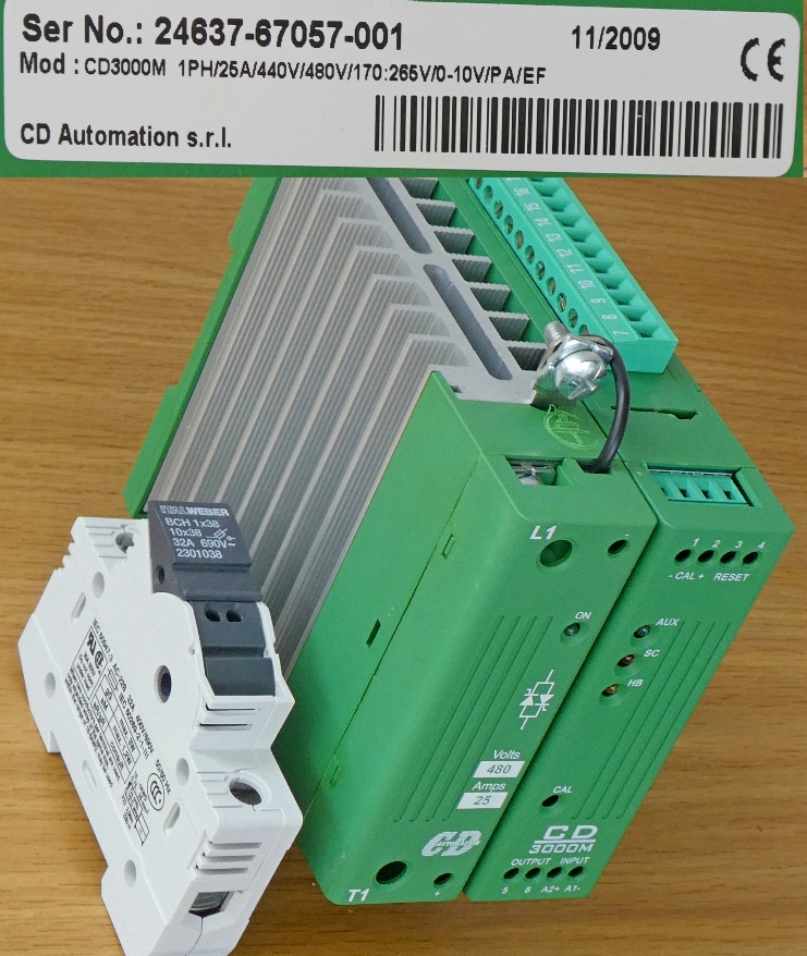 | CD3000M-1PH-25A | CD Automation power controller CD3000M for resistive and inductive last 1-phase Max. current 25 A Voltage 480 V Control 0...10 V External fuse included |